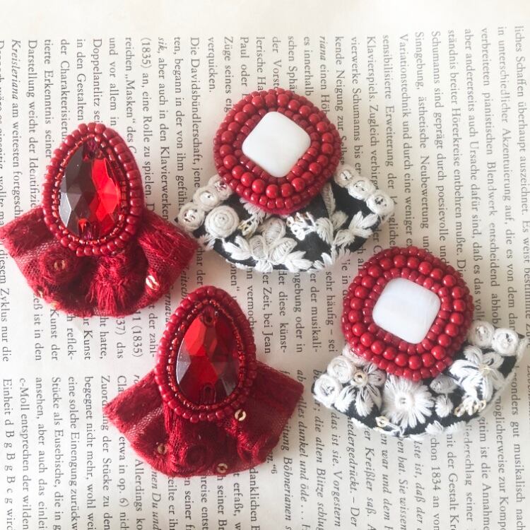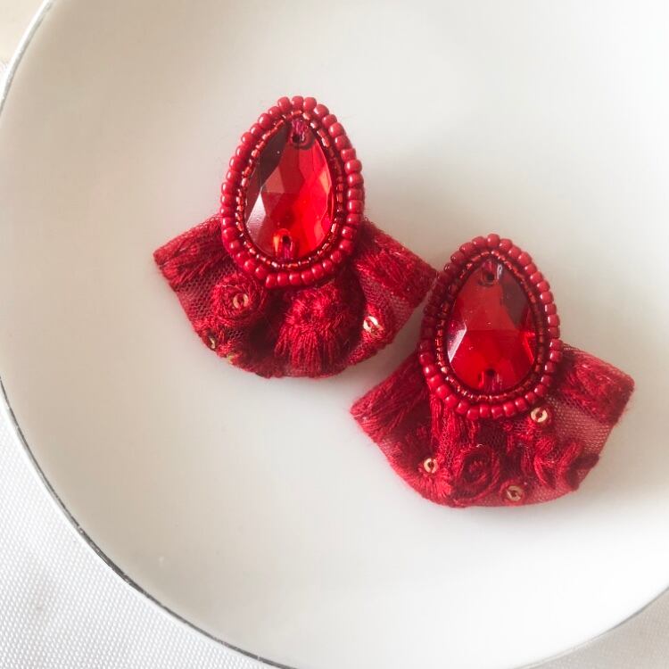 刺繍とガラスビジューの大ぶりアクセサリーです。